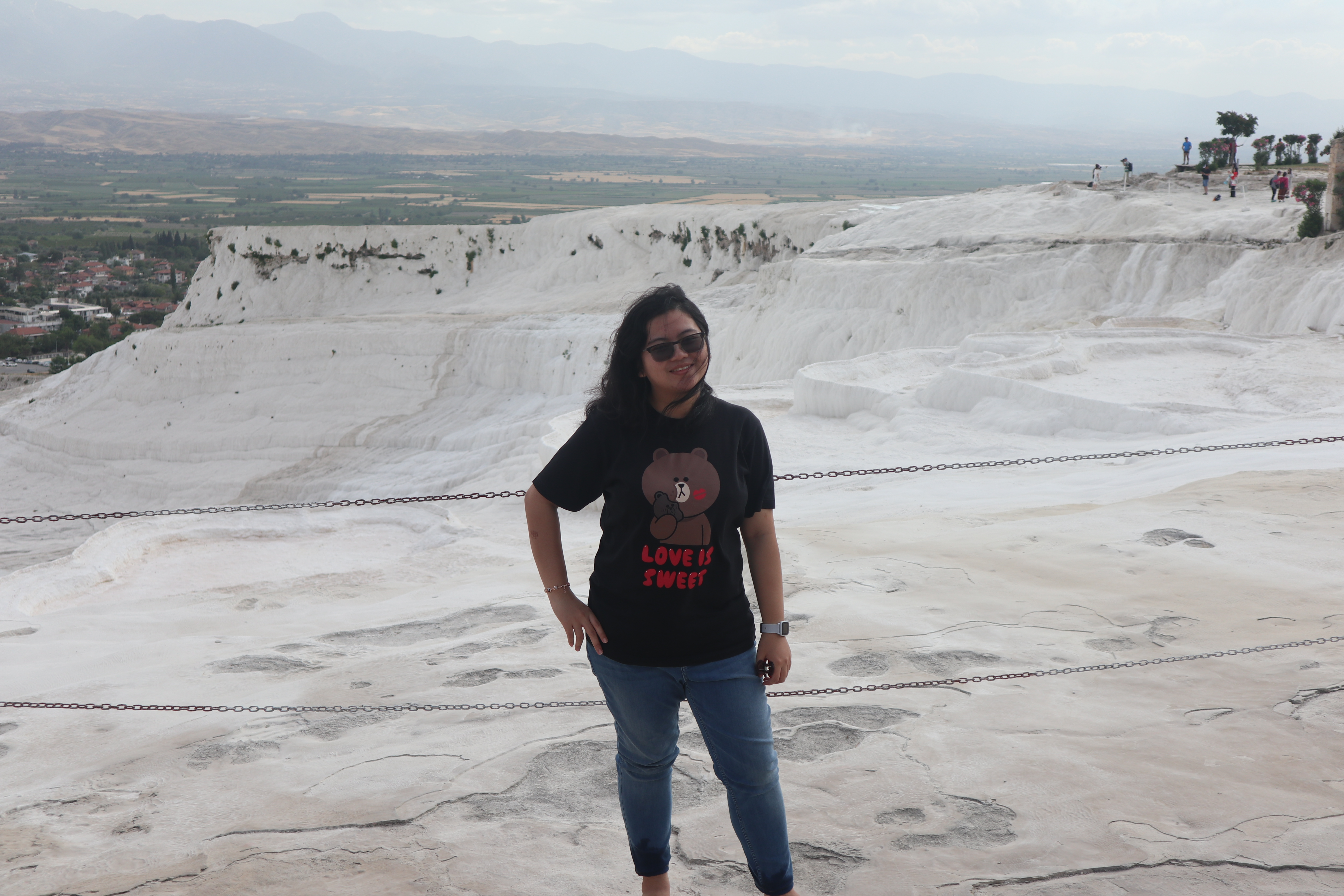 Setelah berkeliling di Ephesus City selama 1 jam lebih, kami segera makan siang lalu lanjut ke The White Travertines (Cotton Castle) dan Hierapolis Ancient City. Pamukkale artinya adalah ‘cotton castle’ dan Hierapolis adalah kota untuk Hiera (bagi yang penasaran ceritanya, googling aja ya). Kedua objek wisata ini berada dalam satu area yang sangat luas. Cotton Castle itu bentuknya seperti terasering dan di setiap kawahnya berisi air hangat sekitar 35 derajat celcius serta travertines, mineral karbonat yang ditinggalkan oleh air mengalir.