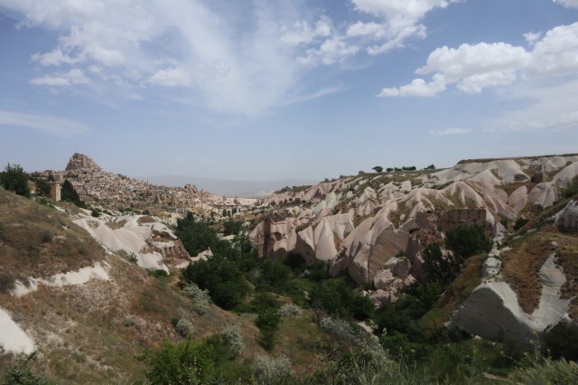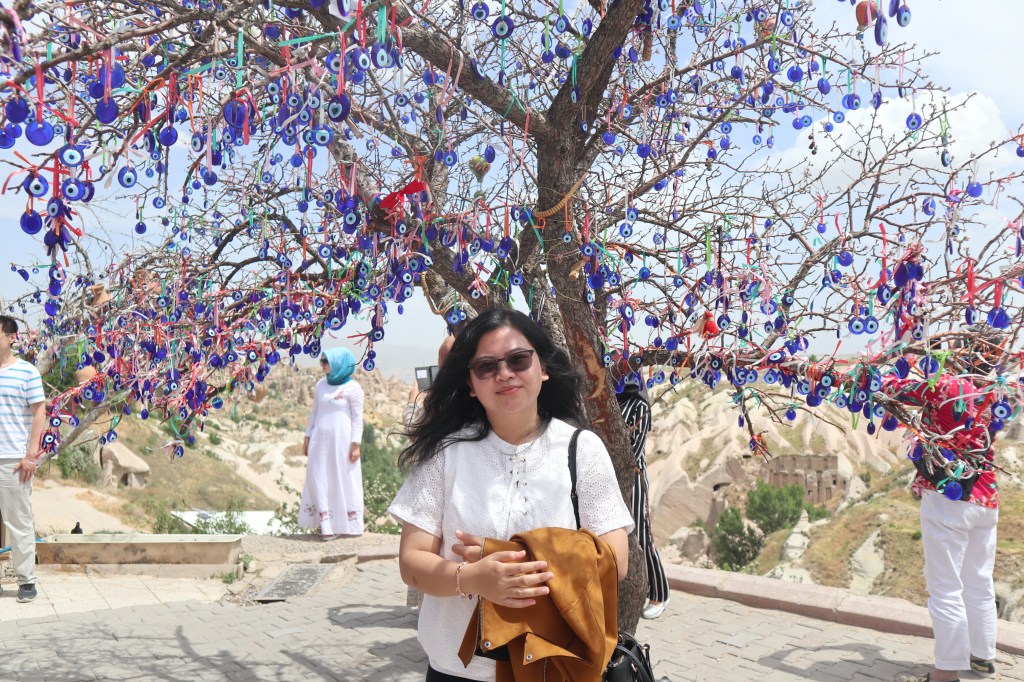 Jarak satu tempat wisata ke tempat wisata yang lain di Cappadocia saling berdekatan. Paling hanya butuh waktu sekitar 5 – 15 menit aja untuk berpindah tempat. Tempat kedua yang dikunjungi adalah Pigeon Valley. Di Pigeon Valley ini terdapat pohon yang ada banyak gantungan berbentuk mata. Gantungan khas Turki ini disebut dengan Evil’s Eye. Masyarakat Turki percaya simbol ini sebagai penolak atau penangkal bala, jadi umum diletakkan di depan rumah, di mobil, atau dipakai sebagai gantungan kunci aja.