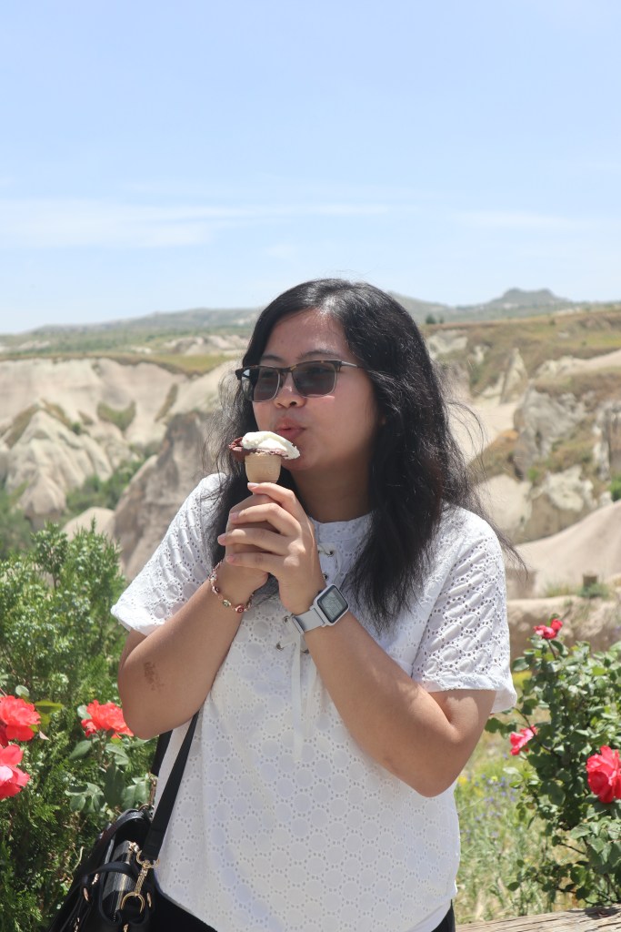 Selanjutnya mampir sebentar ke Uchisar Valley. Kami tidak lama disitu, paling hanya 10 menit. Setelah ini adalah part paling melegakan di siang hari yang sangat terik yaitu makan es krim gratis. Turkish Ice Cream sangat terkenal, dan kami diperbolehkan untuk menikmatinya dengan gratis sambil mengantri berfoto dengan baju Ottoman.